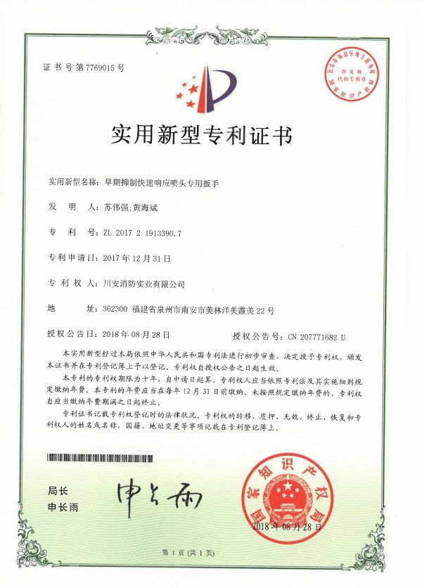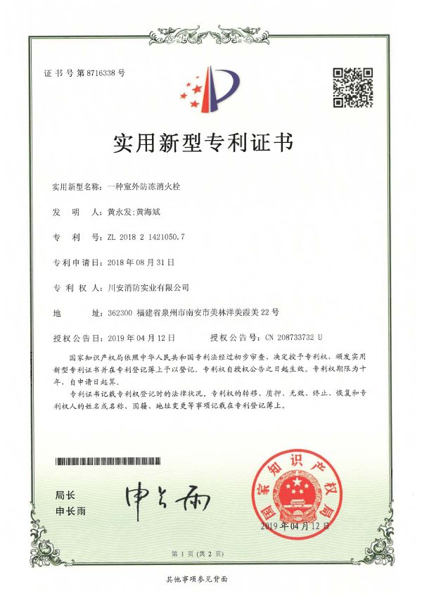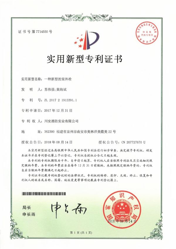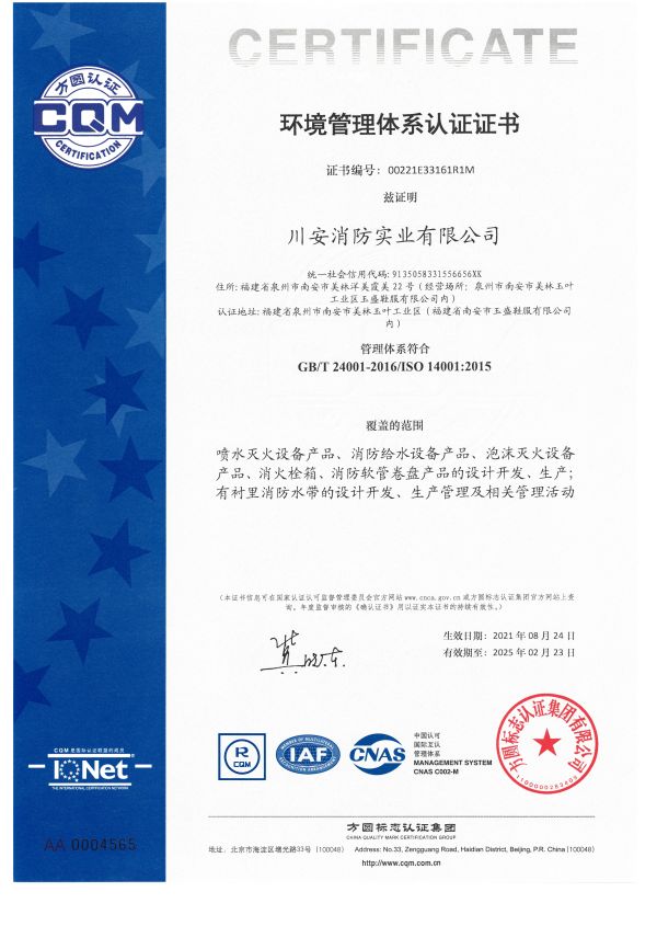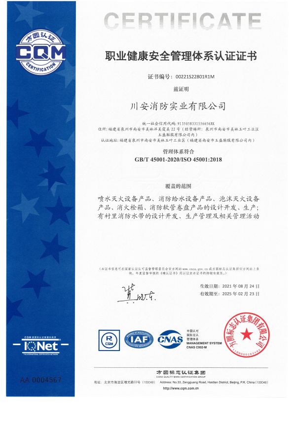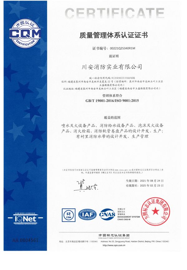 川安消防產(chǎn)品有預(yù)作用裝置、濕式報(bào)警閥、雨淋報(bào)警閥、活塞式雨淋報(bào)警閥、干式報(bào)警閥、減壓閥、泄壓閥、末端試水裝置、智能末端試水裝置、水流指示器、灑水噴頭、干式灑水噴頭、雨淋噴頭、特殊應(yīng)用噴頭、易熔合金灑水噴頭、齊平式灑水噴頭、早期抑制快速響應(yīng)(ESFR)噴頭、擴(kuò)大覆蓋面積灑水噴頭、水霧噴頭、水幕噴頭、泡沫噴頭、室內(nèi)消火栓、室外消火栓、智能消火栓、消防水泵接合器、消防水槍、消防接口、 不銹鋼內(nèi)扣式接扣、壓力開(kāi)關(guān)、消防信號(hào)閘閥、消防信號(hào)蝶閥、消防閘閥、消防蝶閥、消防軟管卷盤、有襯里消防水帶、固定式消防炮、消火栓箱、防爆壓力開(kāi)關(guān)、防爆電磁閥、防爆消防信號(hào)蝶閥、卷簾式水帶箱、壓力式比例混合裝置、半固定式(輕便式)泡沫滅火裝置、閉式泡沫-水噴淋系統(tǒng)、低倍數(shù)空氣泡沫產(chǎn)生器、泡沫槍、泡沫消火栓、泡沫消火栓箱、泡沫滅火劑、水系滅火劑、滅火器(干粉、水基、二氧化碳)、七氟丙烷(單柜、雙柜、4.2內(nèi)貯壓式、5.6內(nèi)貯壓式、4.2外貯壓式、5.6外貯壓式)、懸掛式七氟丙烷等500多種,產(chǎn)品均經(jīng)國(guó)家檢測(cè)中心檢測(cè)合格并取得公安部消防產(chǎn)品型式認(rèn)可和自愿性認(rèn)證證書。產(chǎn)品廣泛應(yīng)用于眾多國(guó)家級(jí)重點(diǎn)工程,大型公眾場(chǎng)所和專業(yè)市場(chǎng)等,深受客戶認(rèn)可與好評(píng)。
