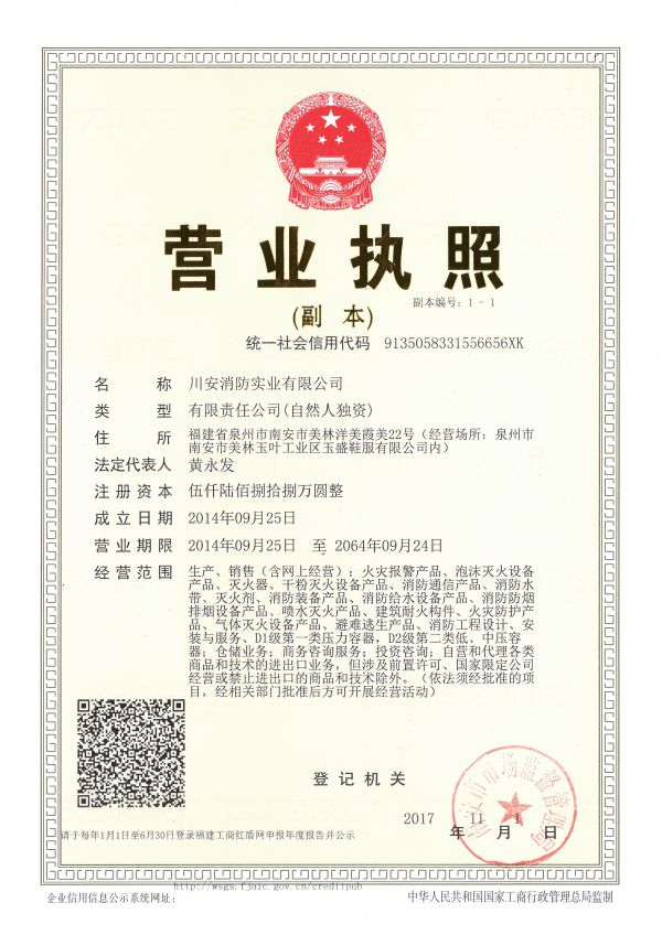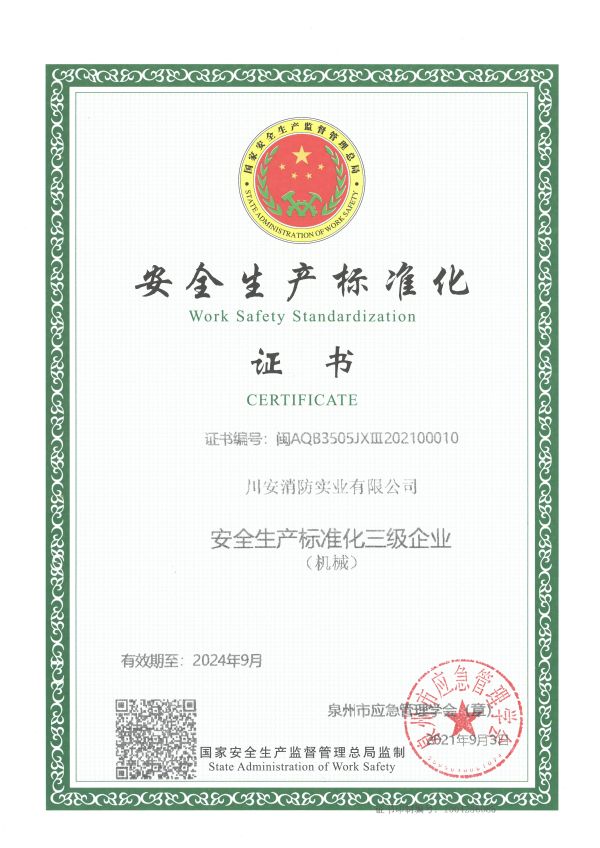 風(fēng)雨歷程,銳意進(jìn)取,敢為人先。川安消防實(shí)業(yè)有限公司創(chuàng)建于2012年,位于福建東南沿海著名僑鄉(xiāng)泉州市南安,是一家集”研發(fā)、生產(chǎn)、銷售、服務(wù)”為一體的消防設(shè)備產(chǎn)品專業(yè)生產(chǎn)企業(yè),以“用產(chǎn)品和服務(wù)為用戶創(chuàng)造價(jià)值”的經(jīng)營(yíng)理念,公司緊跟先進(jìn)制造和檢測(cè)技術(shù)發(fā)展方向,不斷開(kāi)展技術(shù)創(chuàng)新,追求高質(zhì)量品質(zhì)、為客戶提供優(yōu)質(zhì)的產(chǎn)品和服務(wù)。